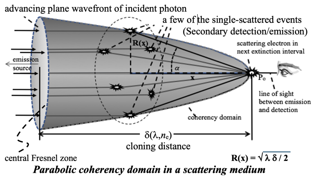 Electrons throughout regions along the general direction of light propagation contribute to a Huygens-like ‘wavelet’ replication process.