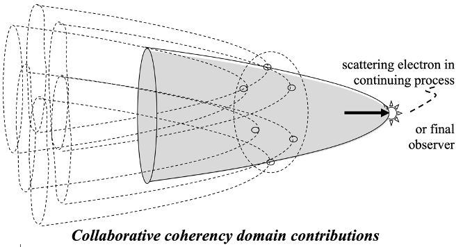 The forward reconstruction process is continuous. Coherency domains overlap in space; as radiation propagates, each successive domain sharing electrons with adjacent domains. Thus the wave is not rebuilt in isolated steps but through a continuously overlapping sequence of coherent regions as shown in the next diagram.