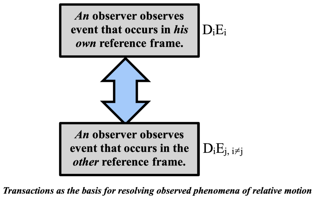 Presuming a relationship between an observer and a light emission ‘event’ involves a categorical error in the same sense as presuming a relationship between a light bulb and a detection event. It’s a mismatch. A transaction is based on a relationship between two events – emission and detection – that defines the exchange of energy and momentum between two objects. Categorical errors are anathema to any critical thinking. Observers and light sources are unaffected by the relative motion of peer objects. it is only by the interchanges between them that they are affected. The time to effect a transaction is affected by the relative dynamics of the parties to the transaction.