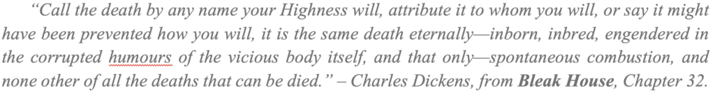 This gets us to Dickens’ right honorable Lord Chancellor Krook.  There was a time when it was believed by more than Dickens that people could suddenly, and without visible cause, burst into flames and die thereof.  An adequate measure of nastiness should by its very nature turn into a fiery death.  So Dickens thought it was a plausible demise for his antagonist ‘Lord Chancellor, Krook.’  But that does not seem to be a plausible phenomenon to us anymore.  We are more reticent to accept explanations involving mysterious origins of events without understanding the mechanism whereby a deed is done.  And yet… who are we?  How much progress have we made?