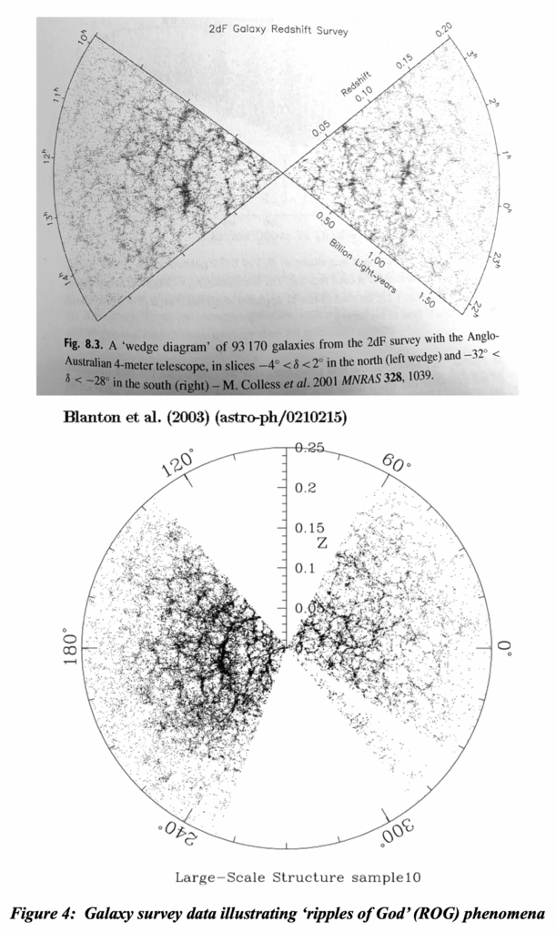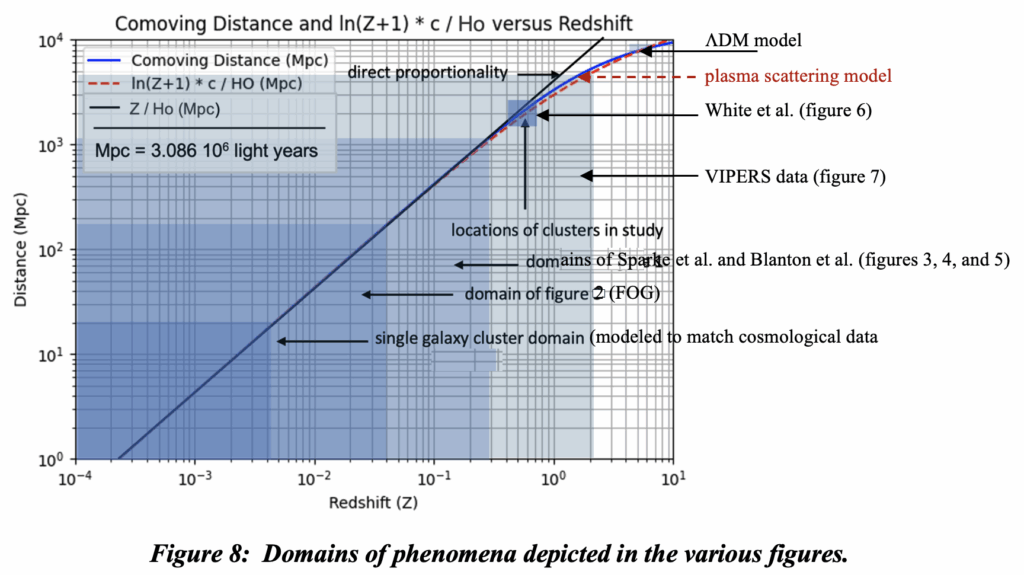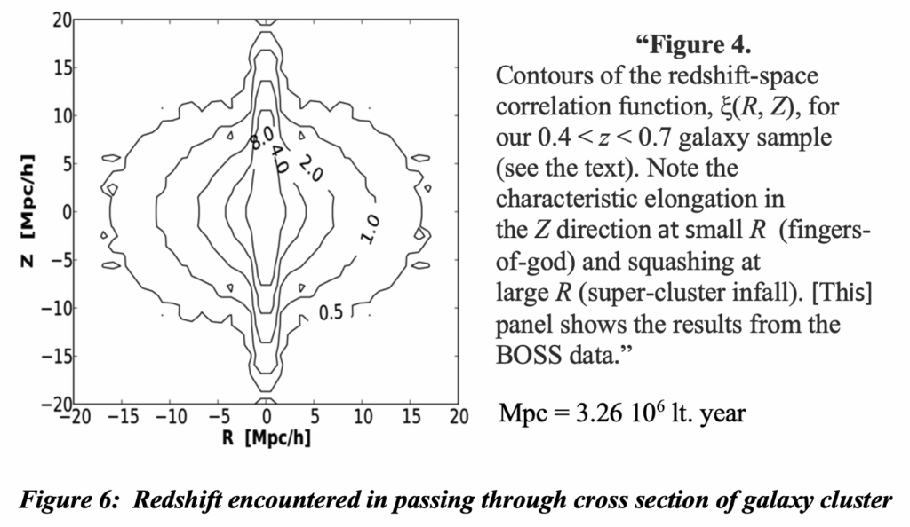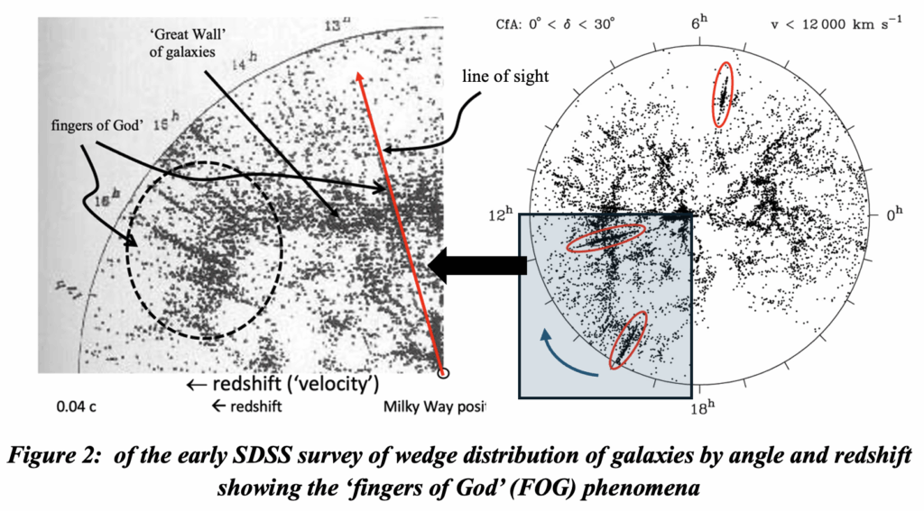 Aware of ‘fingers of God’ (FOG) phenomena that give smaller scale galaxy surveys a suspect aspect of anthropomorphism, I was skeptical of the unreasonable ‘dark matter’ explanation requiring excessive amounts of added (but invisible) matter to produce the phenomena with the simple Doppler interpretation. That was motivation for looking into plasma a scattering interpretation of cosmological redshift that also accounts for the FOG phenomena.
