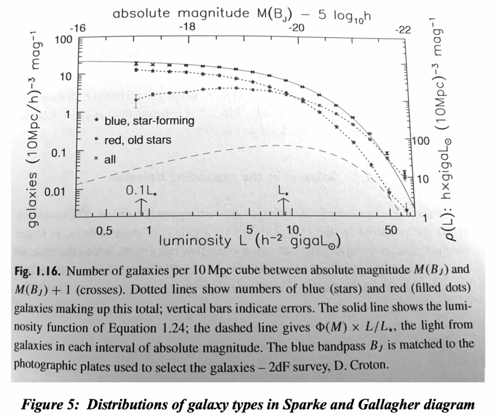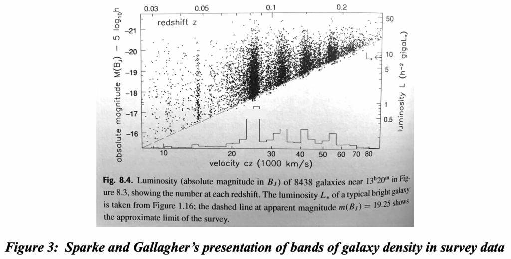 The 2dF survey from which they extracted the chart does demonstrate the appearance that there might be periodicity in the data, but the survey data shown by Blanton et al. (2003) is much more convincing. Treating visibility/luminosity issues in the ripple data references their figure 1.16 for why lower luminosity galaxies are systematically missing from their chart, shown as figure 5.