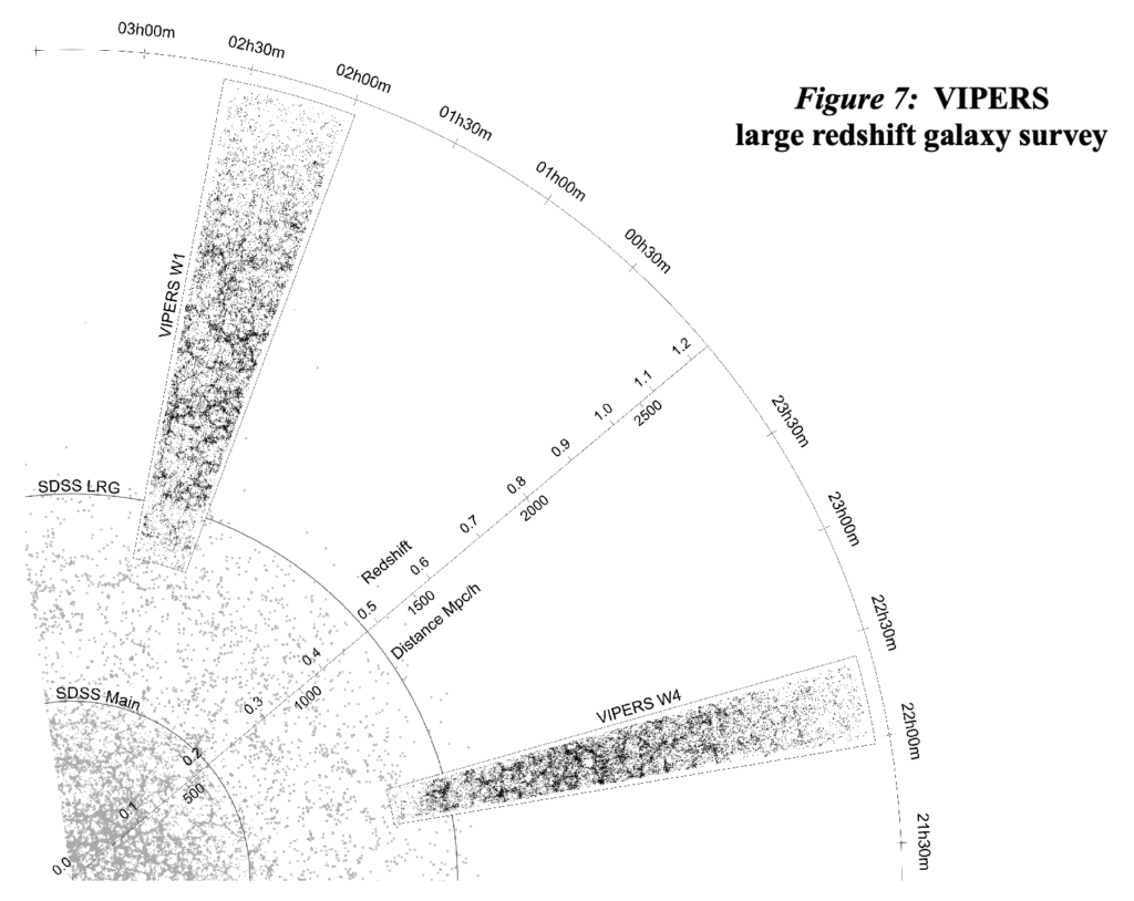 Selection of a model size of galaxy clusters came from White, et al. – specifically from their figure 4 below, where even at large redshifts 20 Mpc radii for clusters was prevalent. And the same degree of lumpiness persists for redshifts beyond unity as shown in the VIPERS data.