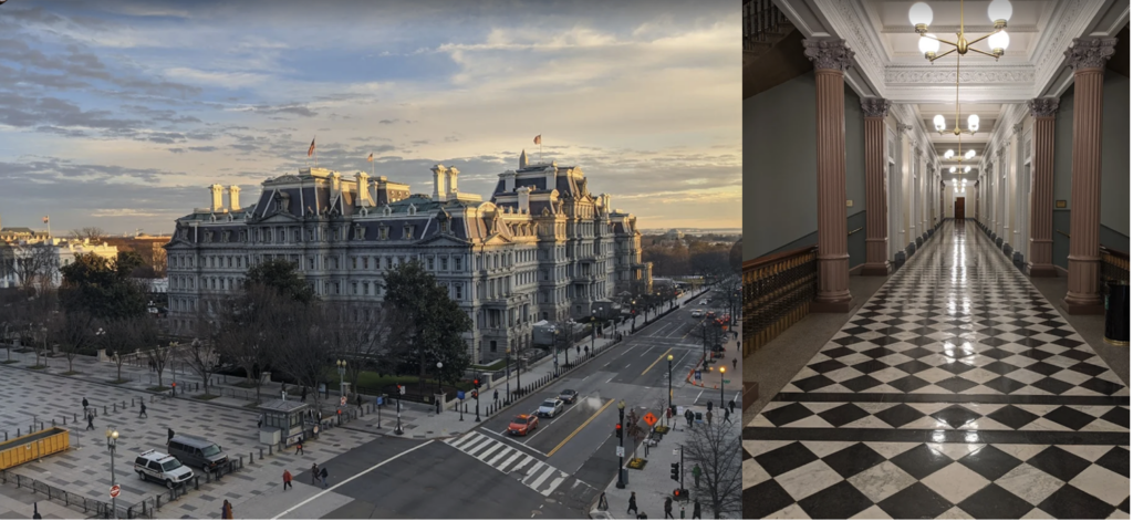 My suspicions seemed to be confirmed when he said, “What do you think? I think we’ll stop by the White House.” What he meant (of course?) was the Eisenhower Executive Office Building adjacent to the White House also on Pennsylvania Avenue. Well, Perry got us in there and met someone he seemed to know who would take him to whoever was more important that Perry was to talk to. Again, I was shown a seat off of a long hallway with an opportunity to rest for a while, no pitch required. Back to the realization of my minor role in life.