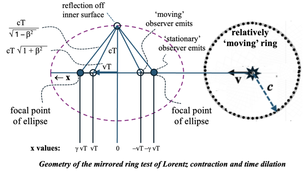 The problem – Einstein’s ‘kinematic problem’ – is that using the Lorentz equations, reflection would not occur at the inner surface of the ring at any location on the ring except directly overhead and below the center. This is shown in the diagrams – most clearly in frame c and g. That is a real problem to be solved. Right? Every light path is extended by a factor of gamma = 1 / root( 1 – (v/c)2 ). To solve this problem he assumed a moving sphere (ring in our case) would be contracted along the direction of relative motion by an inverse gamma factor of root( 1 – (v/c)2 ) and the clock time of an observer associated with the ring would be dilated by the gamma factor. And yes, that does solve his ‘kinematics problem’ as you can see in the similar thought experiment below (and as justified by Penrose in demonstrating that Lorentz contraction can never be observed.) All reflections occur at the inner surface of the contracted ring. But so what? At what cost? That is how you fudge experiments to make things fit the data. It’s not how God would have done it, to mimic Einstein’s sense of when he knew an explanation was valid – usually by it’s simplicity.