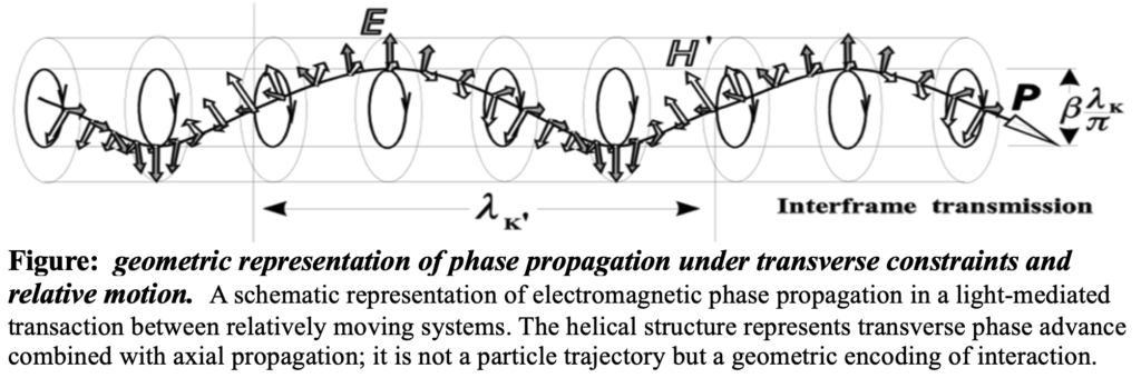 When transverse propagation and aberration are combined, the geometric structure of a light-mediated transaction is naturally helical. The helix is not a path traced by a particle in space, but a geometric encoding of phase advance along a direction of relative motion.